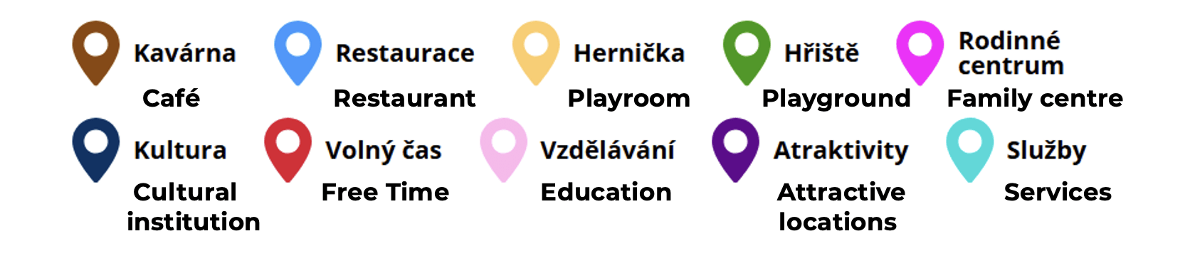 These places are clearly marked with a “Family Friendly Place” sticker and can be found on an interactive map on the Fajna rodina website, where they are differentiated by various colours. Translated map legend is provided below.